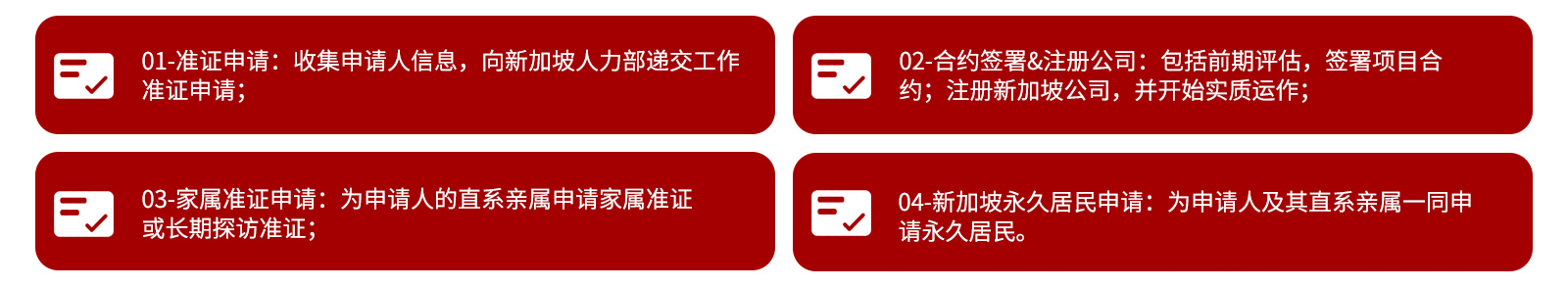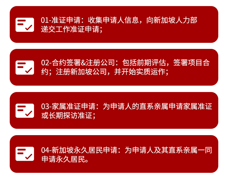 目标人群:有投资移民意愿;对于新加坡移民有着强烈的意愿,并且在新加坡开设公司;具备一定经济基础;拥有足够的投资资金,作为公司启动资金;充足的时间精力;决定在新加坡花费时间和精力对公司进行经营管理的成功企业家;接受移民时间成本;新公司运作至少6个月,才可为申请人申请自雇就业移民