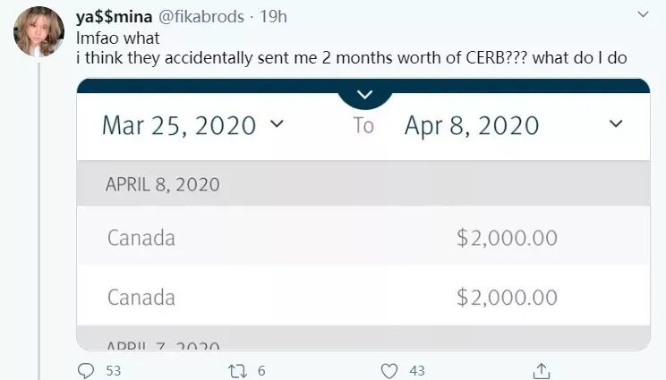 自从加拿大紧急救助金(CERB)申请计划开放以来,已经陆续有人收到了这笔救助金。但有不少网友爆料,说他们的EI和CERB出问题了,政府突然多发了一大笔钱,高达$4000以上……