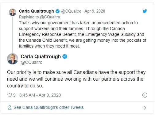 联邦就业部长Carla Qualtrough在Twitter上表示,“当下要做的是确保疫情中的加拿大人能够尽快获得所需的支持。”此外她还提到,“并不担心有人冒领救助金,加拿大人通常表现的非常诚实!”