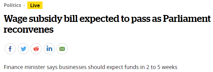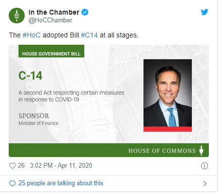 随后,国会议员们讨论并通过了,这项自二战以来最大的一项紧急薪资津贴项目,特鲁多政府和反对党达成协议,各党全部支持。(我们看到平时在选举的时候各党吵翻天,为了一条油管都对骂几年不休,而此刻所有的党却前所未有的一致,只因为他们的共同目标是一致的,为了人民和国家平安!)