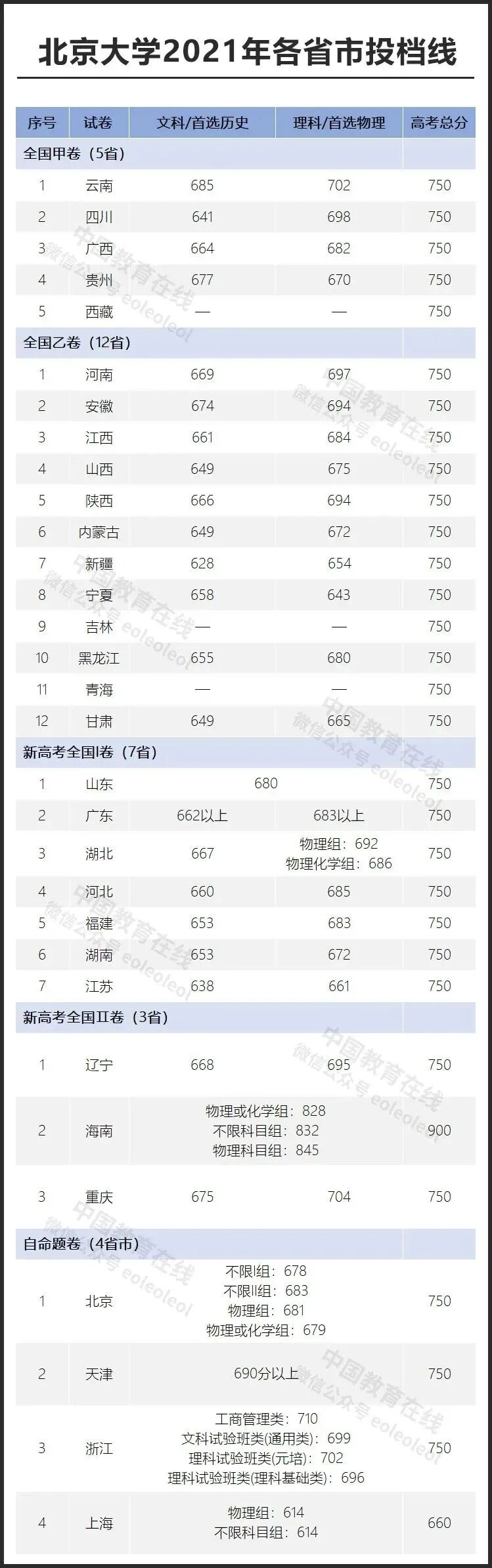2021年全国高考共有8套试卷,分别为全国甲卷、全国乙卷、新高考Ⅰ卷、新高考Ⅱ卷,北京卷、天津卷、上海卷、浙江卷。除上海(660分)、海南(900分)外,其余省市满分均为750分。