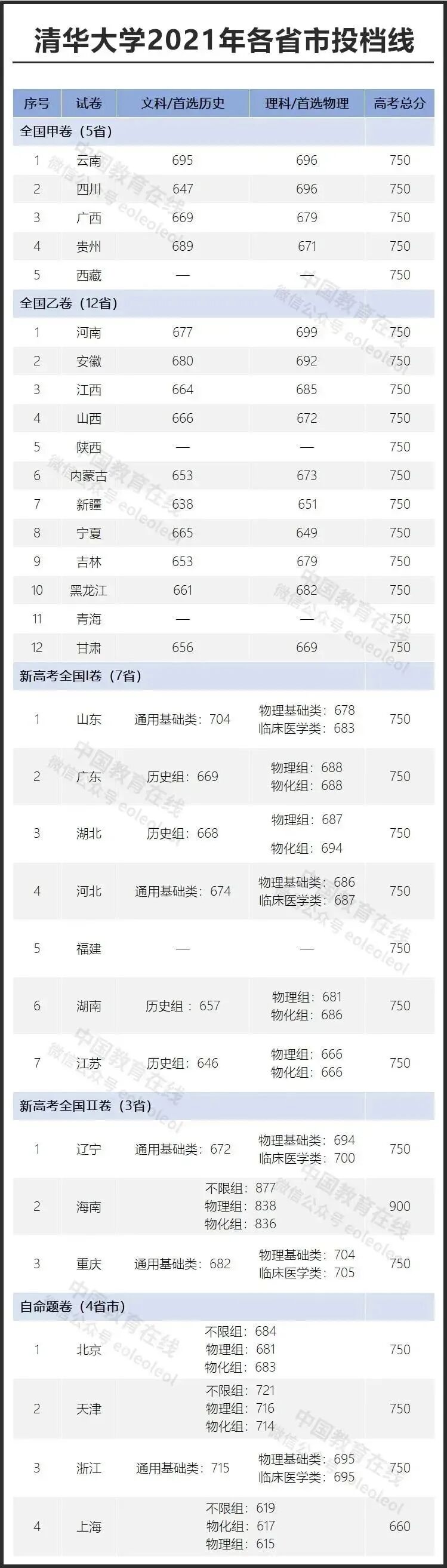 从清华大学在各省的普通类招生最低投档分数线来看,使用全国甲卷的5个省份中,云南、四川两省的理科录取投档线最高,为696分;文科录取线最高的也是云南,需要695分。使用全国乙卷的12个省分中,理科录取分数线最高的为河南,需要699分;文科录取最高的为安徽,需要680分才能被清华大学录取。自主命题的4个省份中,在天津的全部专业组超过了710分,最低专业组合为714分,意味着最少要714分才能够上清华大学。