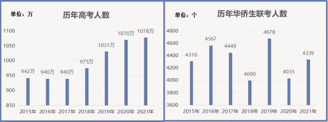华侨生联考每门满分为150分,总分与高考一样为750分,所以说华侨生的录取分数是远远低于普通高考的,而且2021年参加华侨生联考的人数只有不到5000人,目前全国招收华侨生的高等院校却多达300多所,每年能够提供高达15000个录取名额。因此只要参加华侨生联考,被录取的可能性是非常高的,对于万千学子而言,真正验证了一句话,有时候,选择比努力更重要。