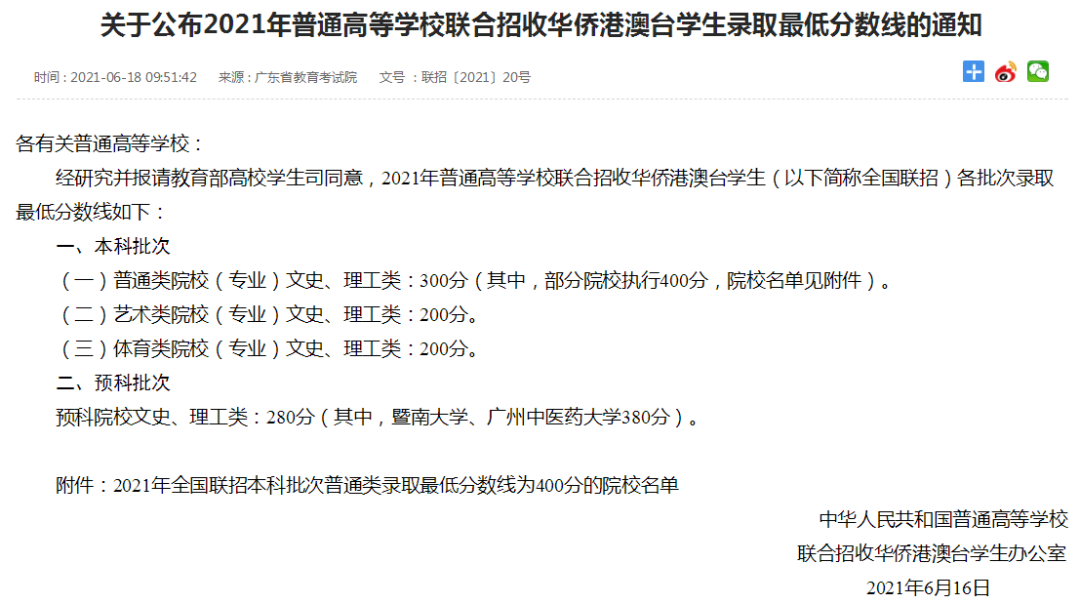 6月16日,中国普通高等学校联合招收华侨港澳台学生办公室,公布了2021年普通高等学校联合招收华侨港澳台学生录取最低分数线!400分上985/211,200分上本科!其中不乏清华、北大、人大、复旦、交大这样的中国顶尖学府。